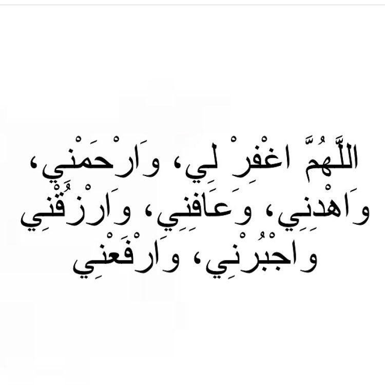 الل ه م اغ ف ر ل ي و ار ح م ن ي و اه د ن ي و اج ب ر ن ي و ع اف ن ي و ار ز ق ن ي و ار ف ع ن ي Allaahum Maghfir Lee Warhamnee Wahdinee Wajburnee Wa