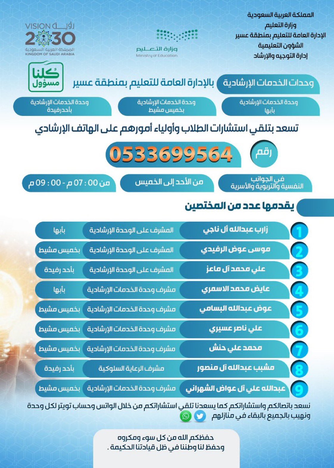 إدارة تعليم عسير On Twitter أقرت الإدارة العامة للتعليم في منطقة عسير ممثلة في إدارة التوجيه والإرشاد تخصيص هاتف إرشادي لتقديم الدعم في الجوانب النفسية والأسرية والتربوية للطلاب وأولياء أمورهم تعليم عسير كلنا مسؤول