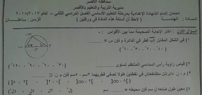 ورقة امتحان الهندسة للصف الثالث الاعدادى ترم ثاني 2018 محافظة الأقصر